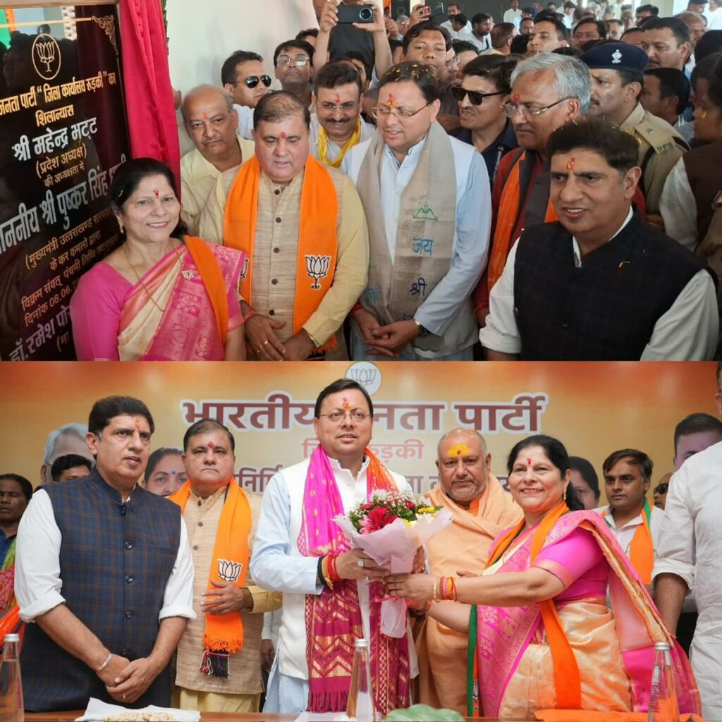 दिल्ली हरिद्वार हाईवे स्थित बिझोली चौक के समीप स्थित जिला कार्यालय लोकार्पण में पहुंचे मुख्यमंत्री पुष्कर सिंह धामी ने हवन में आहुति देने के बाद फीता काटकर कार्यालय का लोकार्पण किया।कार्यालय में आयोजित सभा को संबोधित करते हुए उन्होंने जिलाध्यक्ष एवं जिले के सभी पदाधिकारियों एवं कार्यकर्ताओं को शुभकामनाएं दी। उन्होंने कहा यह कार्यालय इस जनपद में आने वाली सभी छह विधानसभा का ऊर्जा का केंद्र बनेगा। इतना ही नहीं यहां के किसान,मजदूर, आमजन की समस्याओं के समाधान एवं सेवा के लिए यह बड़े आयाम के रूप में स्थापित होगा। उन्होंने कहा कि दो सीटों से यात्रा की शुरू करने वाली पार्टी आज विश्व की सबसे बड़ी पार्टी बनी है इसमें एक एक कार्यकर्ता की मेहनत जुड़ी है। उन्होंने कहा कि इस पार्टी में प्रत्येक कार्यकर्ता का सम्मान है और वह आम कार्यकर्ता से एक बड़े पद तक अपनी काबिलियत से पहुंच सकता है। उन्होंने कहा कि प्रधानमंत्री के नेतृत्व में आज भारत विश्व पटल में बड़ा स्थान बनाए हुए है। आज भारत आत्मनिर्भर देश के रूप में पहचान स्थापित कर रहा है। आज देश फिर से विश्वगुरु बनने की ओर अग्रसर है। उन्होंने कहा कि राज्य सरकार ने लव जिहाद लैंड जिहाद में बड़ी कारवाई करते हुए नौ सौ पचास एकड़ भूमि को कब्जा मुक्त करवाया,प्रदेश में समान नागरिकता कानून लागू कर 2022 में जनता से किया वादा निभाया।उन्होंने कहा कि नकल मामले में विपक्ष ने राजनीतिक रोटियां सेंकने का प्रयास किया और युवाओं को गुमराह करने का प्रयास किया। लेकिन सरकार ने युवाओं की भावनाओं की कदर करते हुए उनकी मांगों को पूरा किया। उन्होंने राज्य एवं केंद्र सरकार की योजनाएं गिनाई। भाजपा प्रदेश अध्यक्ष एवं राज्यसभा सांसद महेंद्र भट्ट ने कहा भाजपा पार्टी एक परिवार की तरह है और सीमित संसाधनों में शुरू हुई पार्टी आज विश्व का सबसे बड़ा राजनीतिक दल है। पूर्व मुख्यमंत्री एवं सांसद त्रिवेंद्र सिंह रावत ने कहा यह कार्यालय जिले के कार्यकर्ता पदाधिकारियों को नई ऊर्जा देगा। कार्यक्रम का संचालन जिला महामंत्री सागर गोयल एवं अक्षय प्रताप सिंह ने किया। इस अवसर महामंडलेश्वर स्वामी यतींद्रानंद,जिलाध्यक्ष डॉक्टर मधु सिंह,राज्यसभा सांसद कल्पना सैनी,जिला पंचायत अध्यक्ष किरण चौधरी, विधायक प्रदीप बत्रा, राज्य मंत्री शोभाराम प्रजापति,राज्य मंत्री श्यामवीर सैनी,जिला उपाध्यक्ष डॉक्टर सौरभ गुप्ता,संजय अरोड़ा,जिला कोषाध्यक्ष नितिन गोयल,जिला मीडिया प्रभारी पंकज नंदा,पूर्व विधायक कुंवर प्रणव सिंह,मयंक गुप्ता,राकेश गिरी, विवेक चौधरी,मास्टर सत्यपाल,रवि राणा सुशील राठी, डॉ अनिल शर्मा,कवींद्र चौधरी, पार्षद संजीव तोमर, पार्षद अनुराग त्यागी, सौरभ सिंघल, सुभाष सरीन,