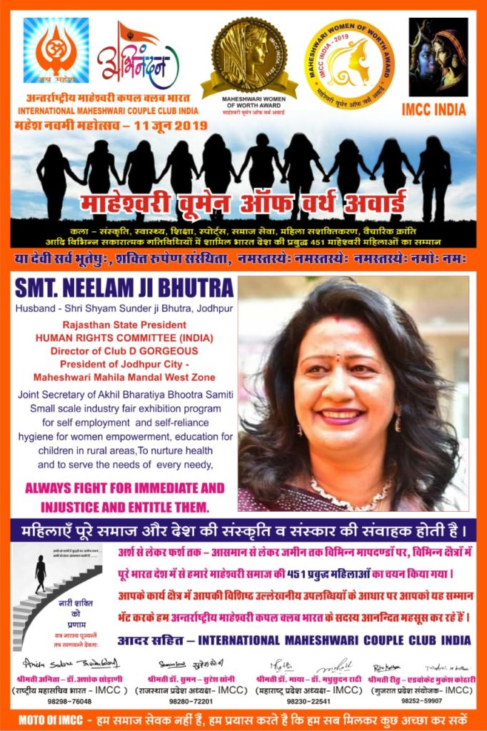 माहेश्वरी वूमेन आॅफ वर्थ अवार्ड 2019 – जोधपुर निवासी मानवाधिकार कमिटी राजस्थान की प्रदेशाध्यक्ष एवं महिला उधमी श्रीमती नीलम जी भूतड़ा को
